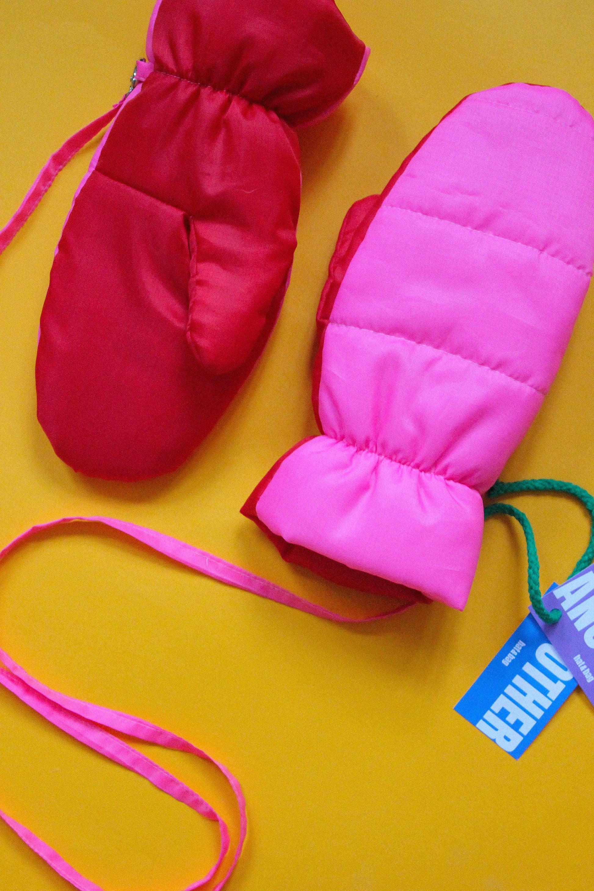 Bicolor Pillow Puffer Mittens on Strings in Hot pink & Red