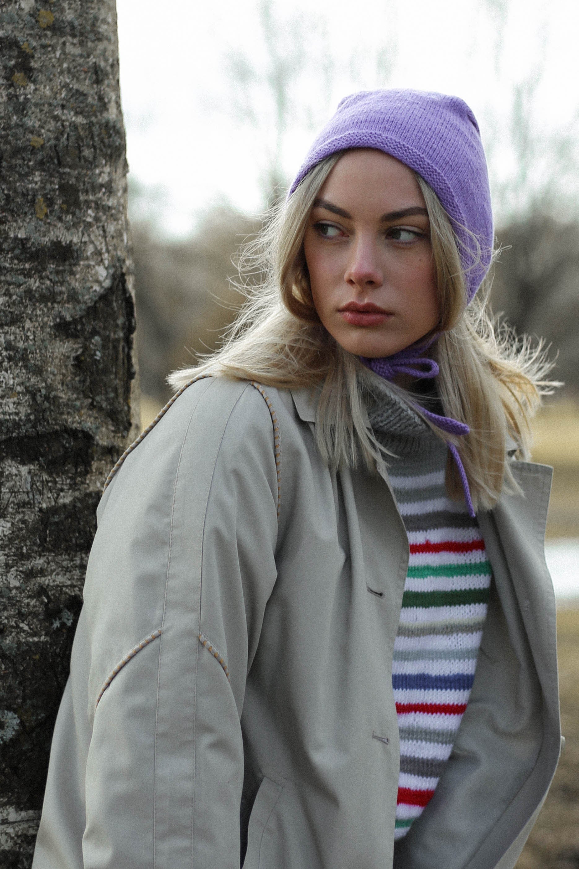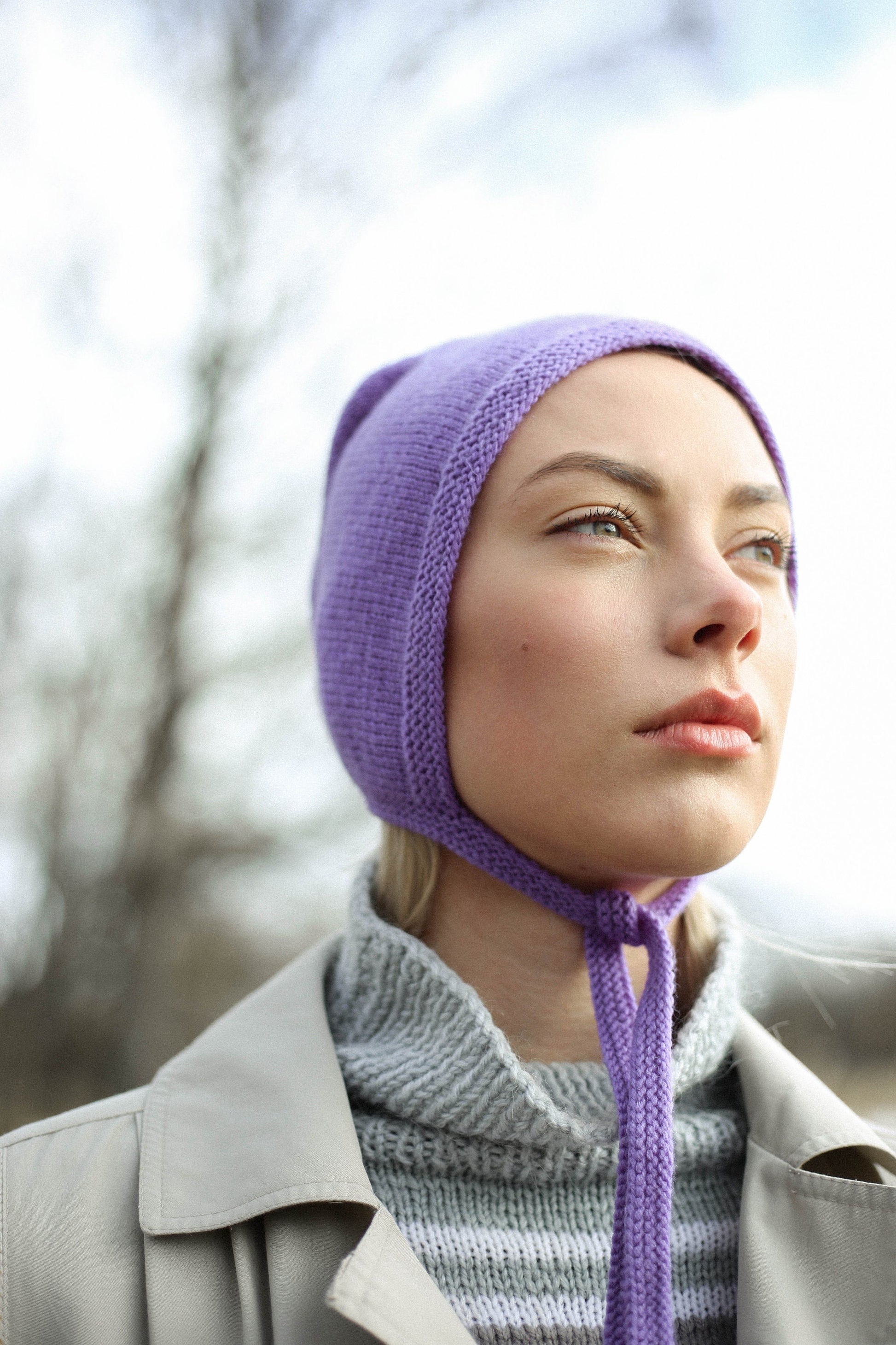 Hand-knitted Adult Bow Tie Bonnet hat in lilac