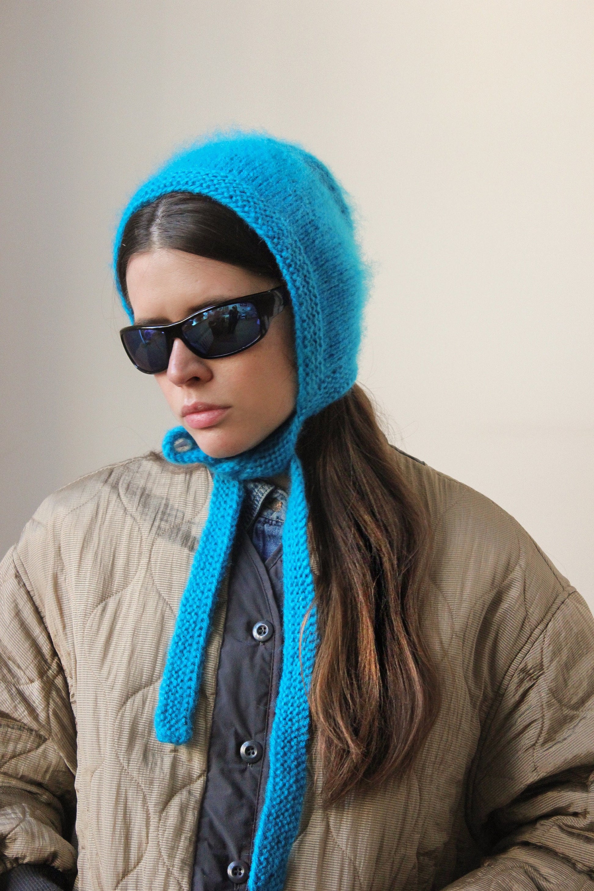 Hand - knitted Adult Bow Tie Mohair Bonnet in Azure Blue