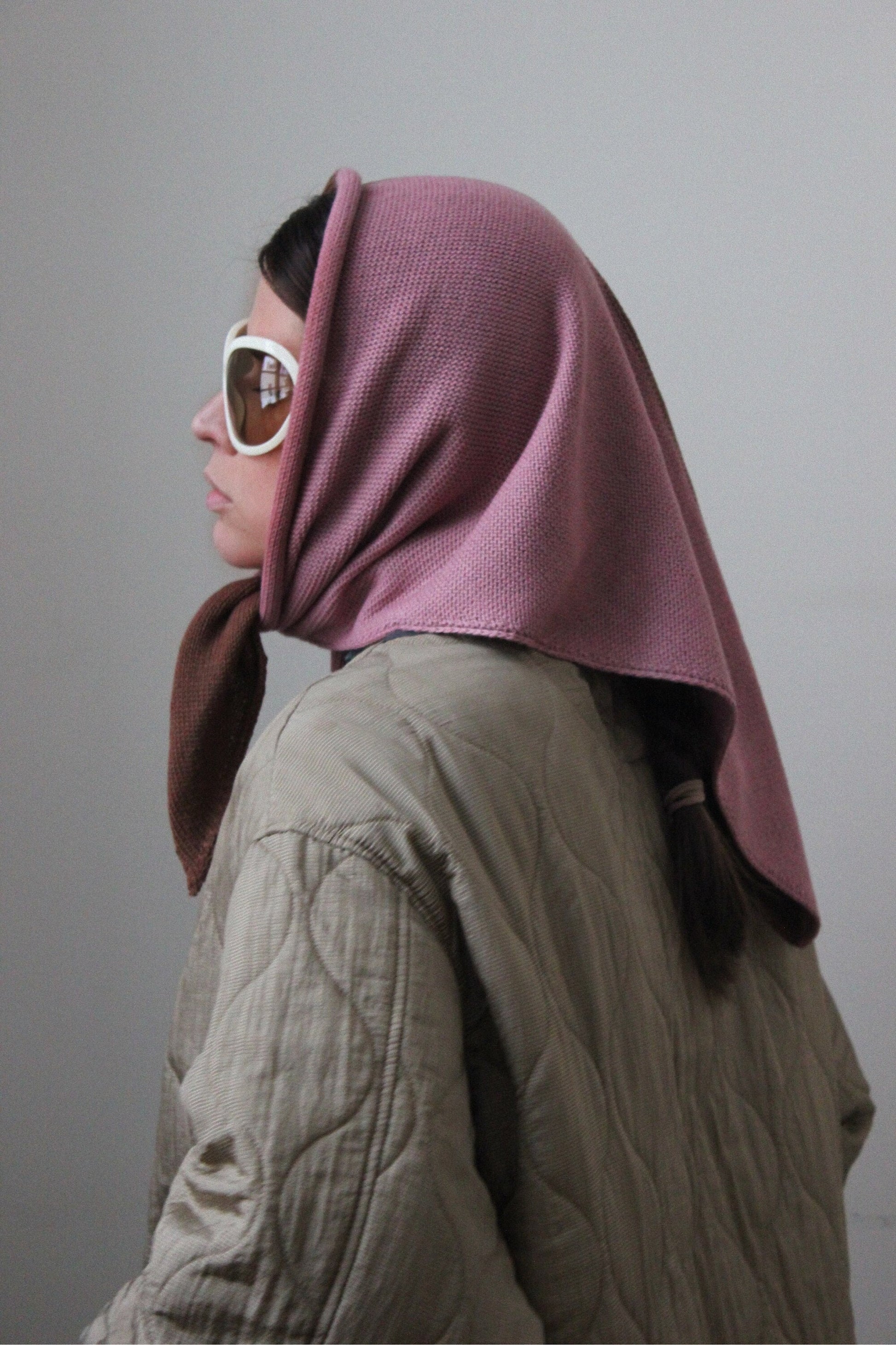 Hand - knitted Bicolour Headscarf in Powder Rose & Brown