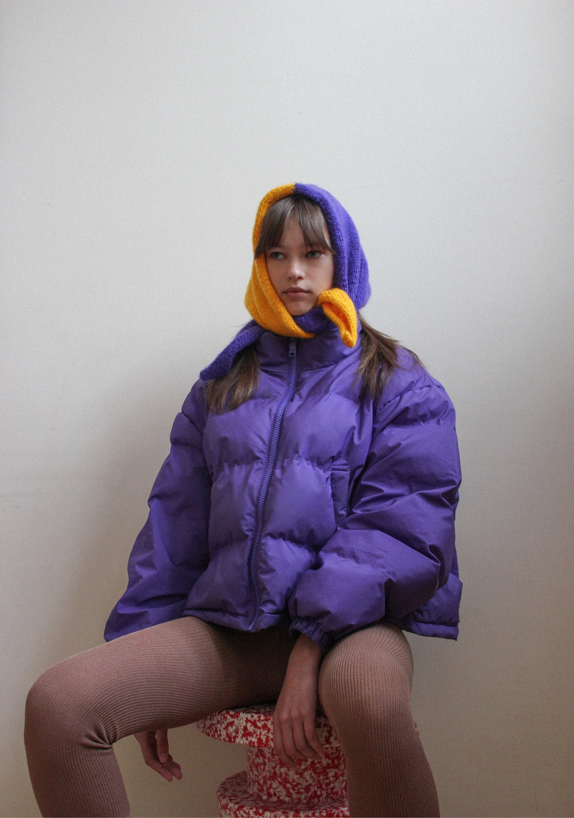 Hand - knitted Bicolour Mohair Headscarf in Rich Yellow & Purple