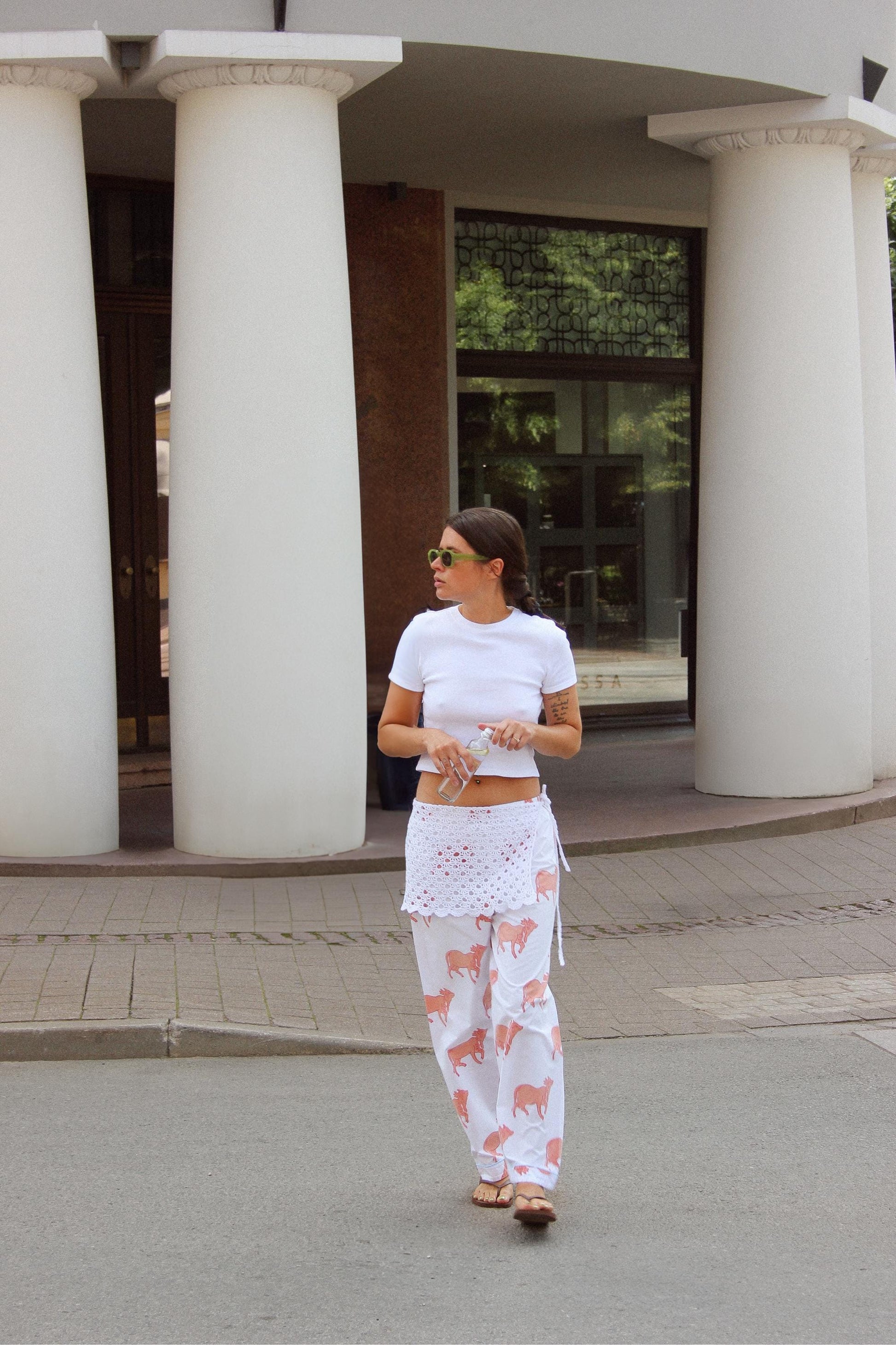 Styled over jeans, trousers, or even tailored pants, this versatile piece adds texture, shape, and a statement to any outfit. Whether you’re going for edgy streetwear or elevated casual, the knit hip wrap is the effortless way to tap into the skirt-over-pants trend – with a unique, cozy flair.