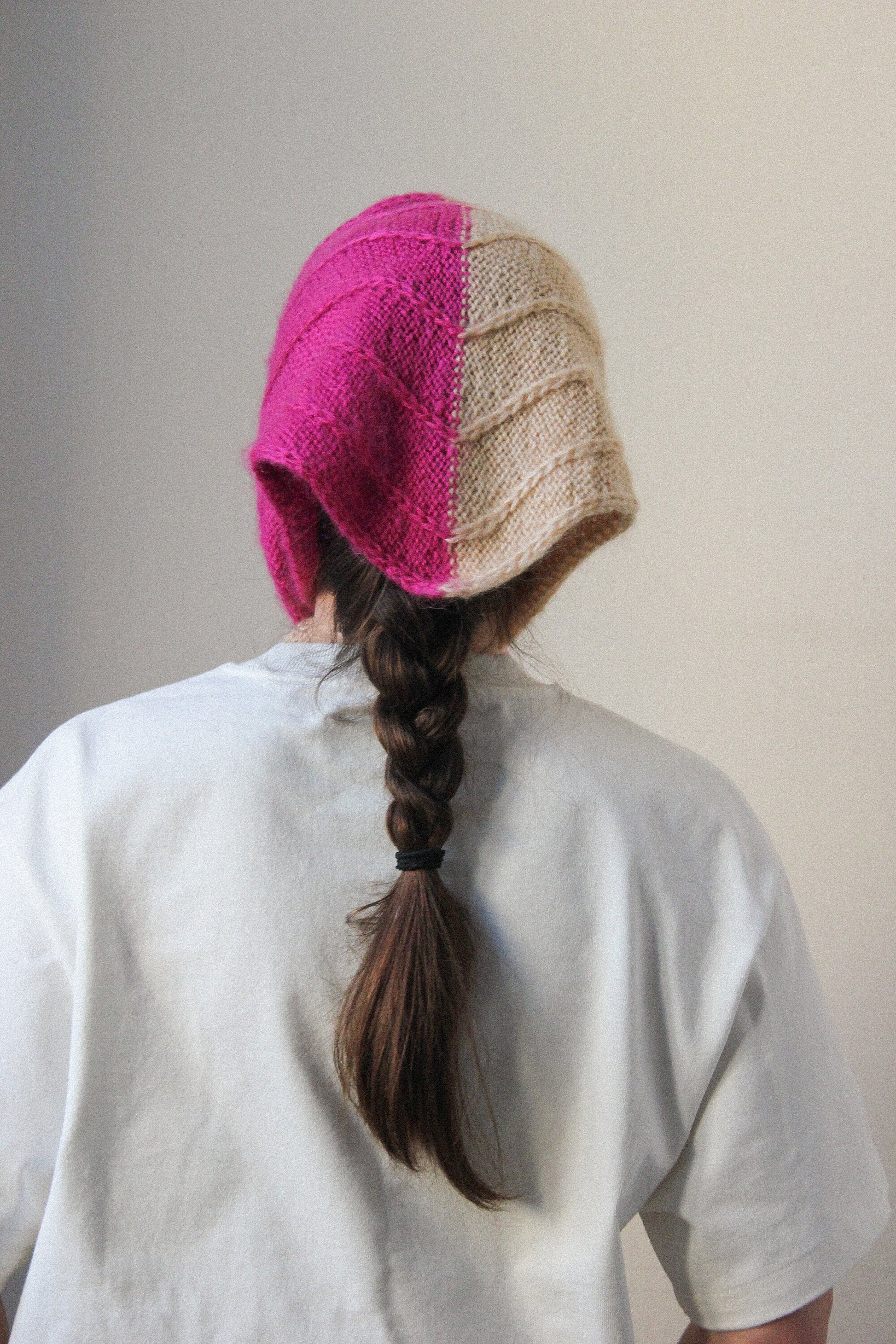 Hand - knitted Mohair Bicolour Headscarf in Crimson & Cream Beige