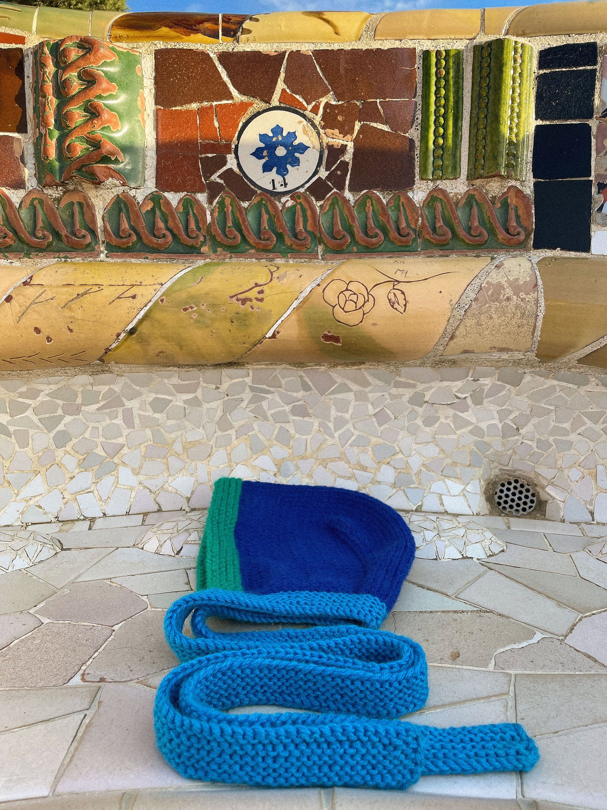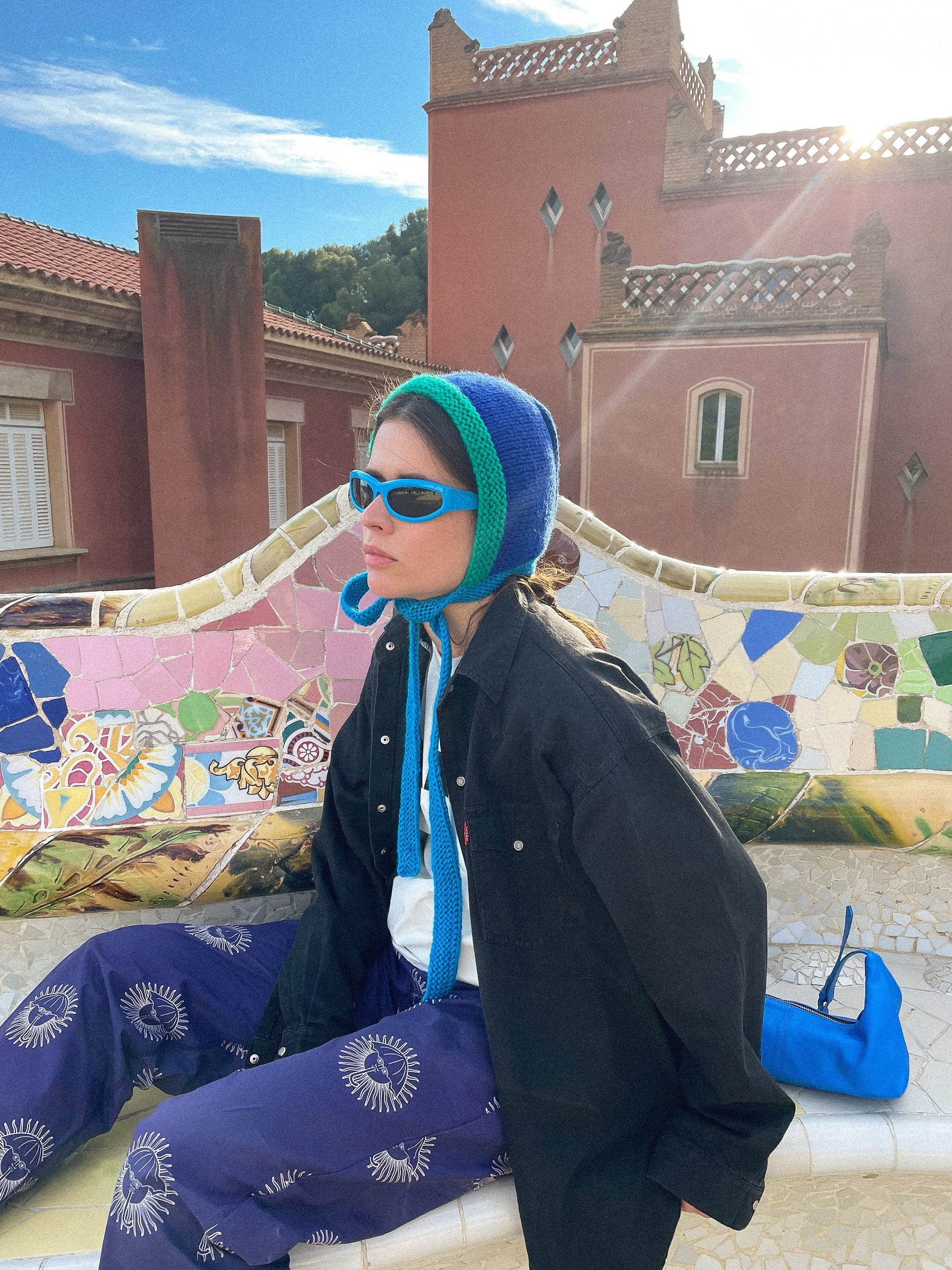 New kid on the block: Hand - Knitted Multi Blue Chunky Bow Tie Bonnet Hat.