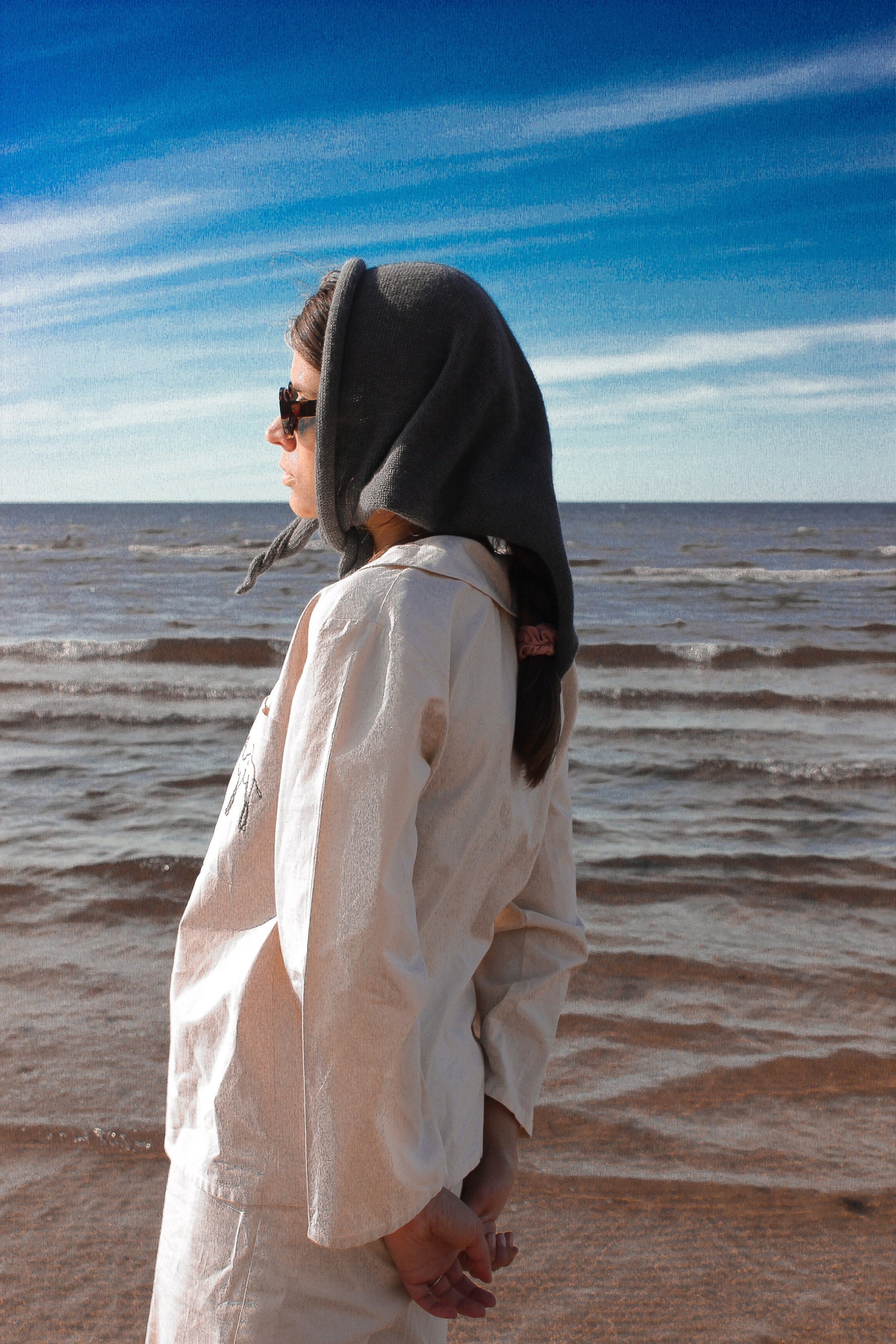 Wrap yourself in the refined softness of our hand-knitted headscarf, crafted from the finest delicate merino wool. Lightweight yet warming, it drapes effortlessly, adding quiet sophistication to your fall–winter looks. An elegant touch that transforms simplicity into statement.
