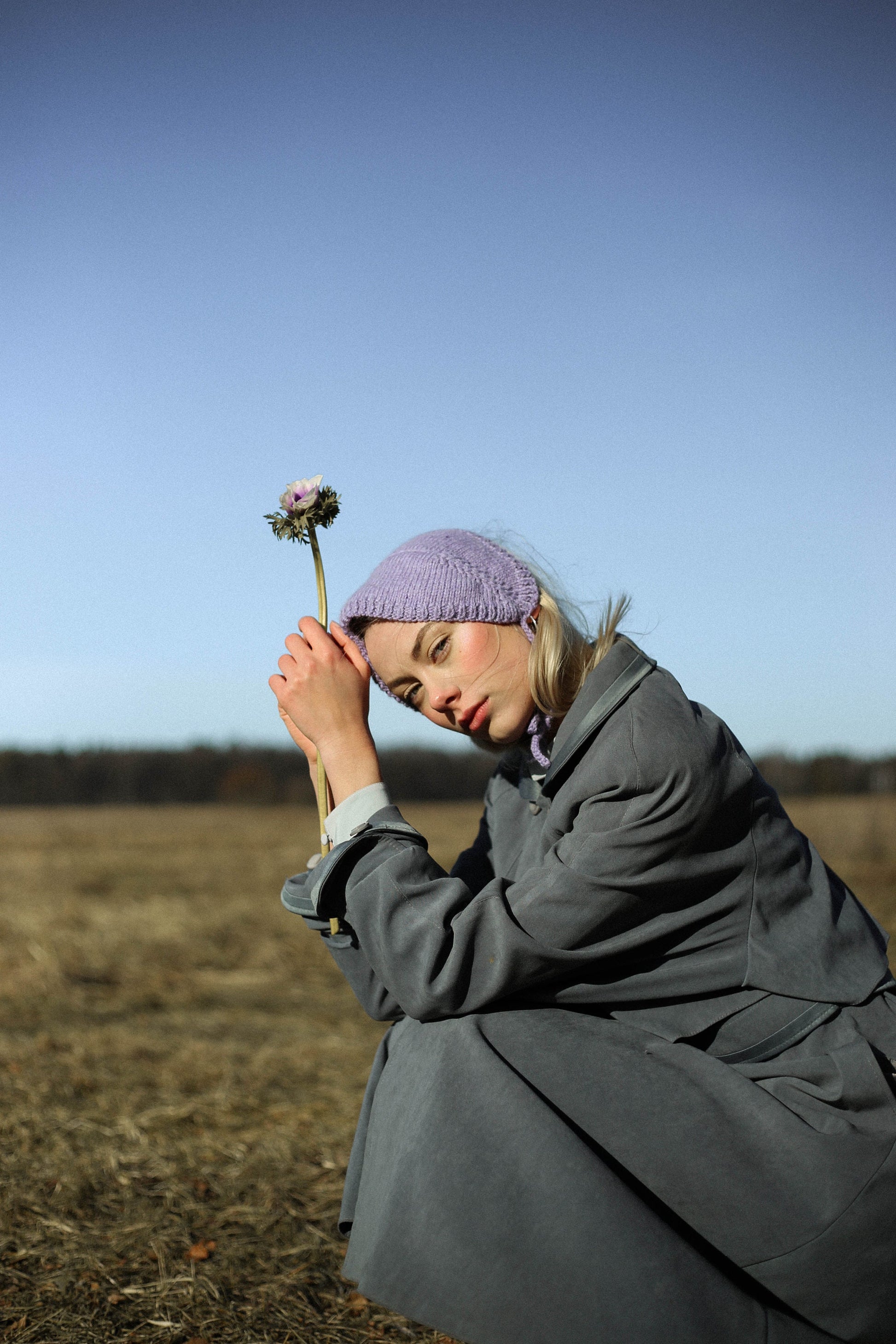 Hand - knitted Adult Bow Tie Bonnet in powder Lilac