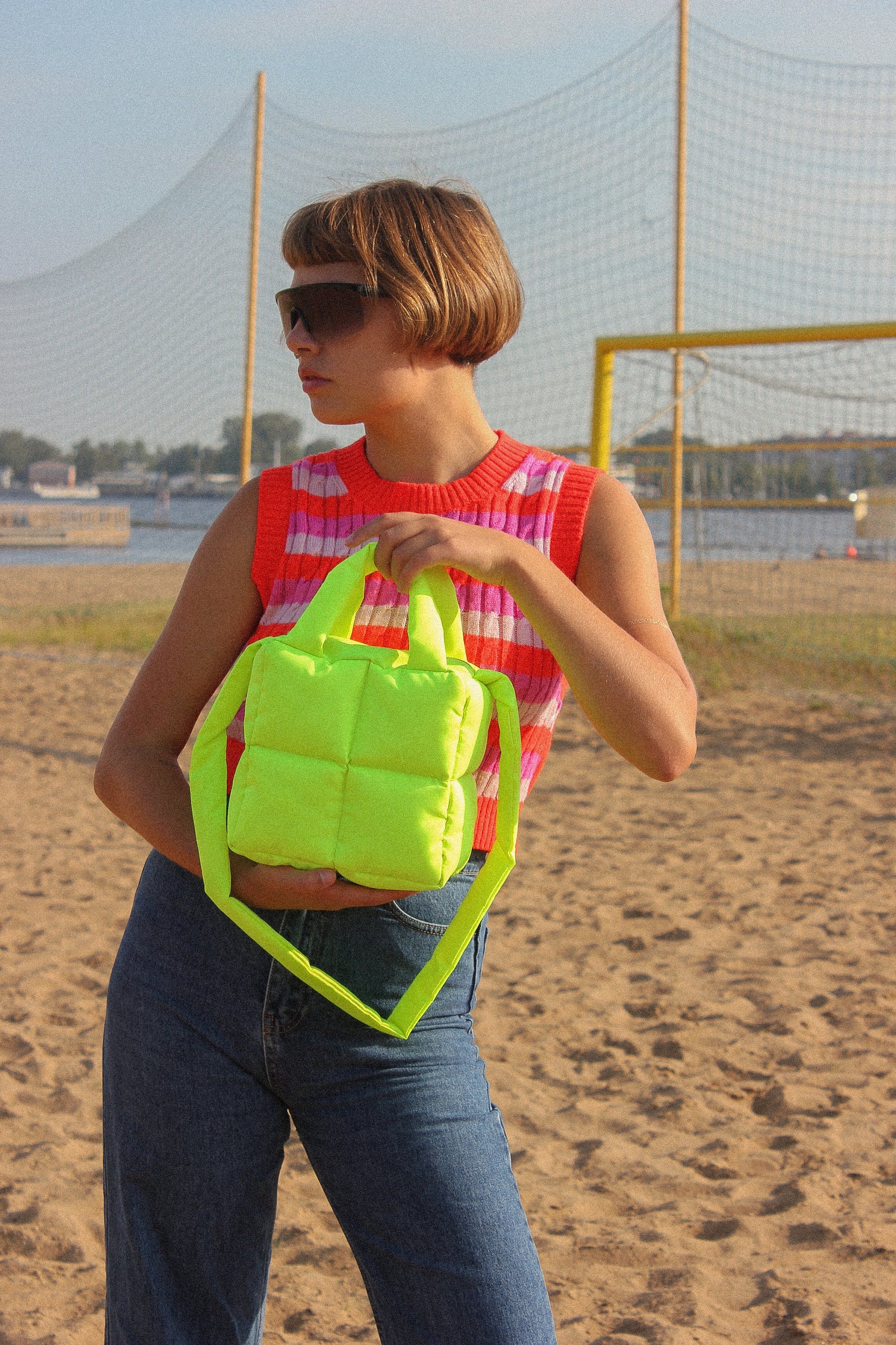 Meet the new, mini version of our Pillow Puffer bag : Baby Pillow Essential bag in neon yellow.