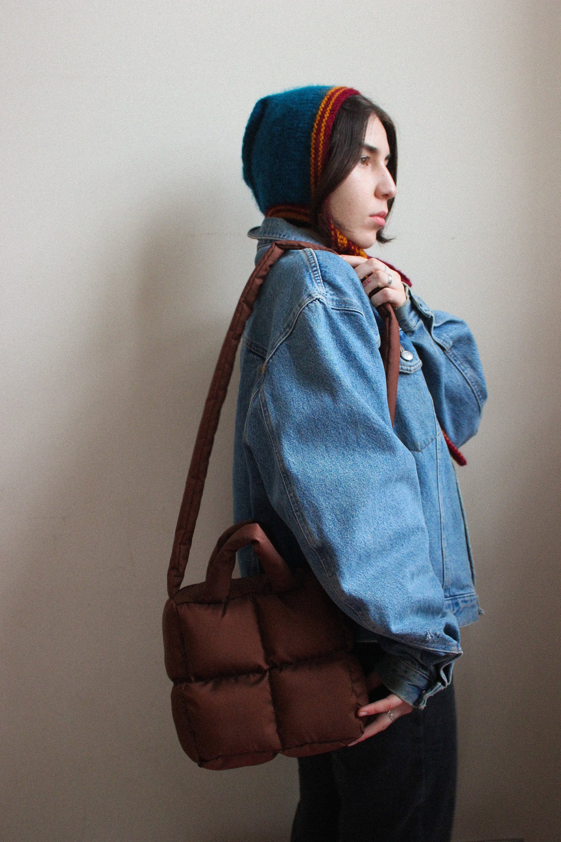 Meet the new, mini version of our Pillow Puffer bag : Baby Pillow Essential bag in brown.