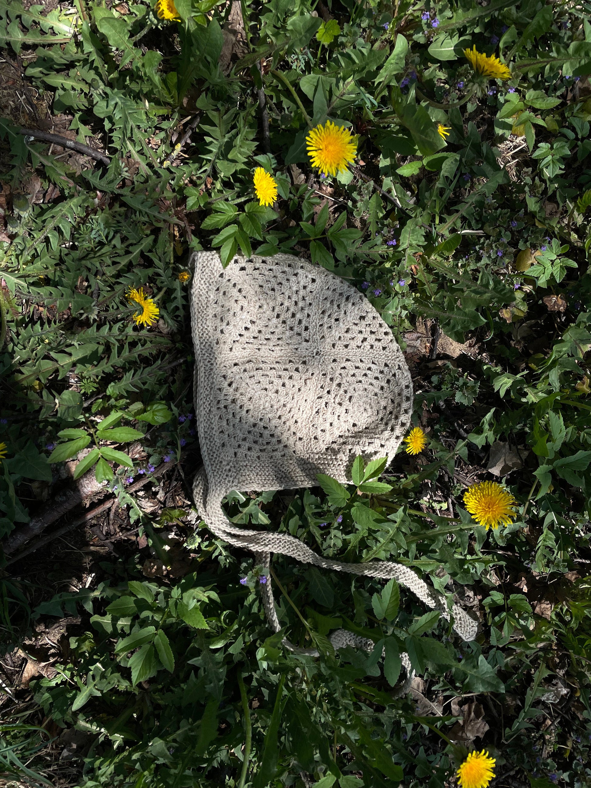 Patchwork granny square Bow Tie Crochet Bonnet in linen shades.