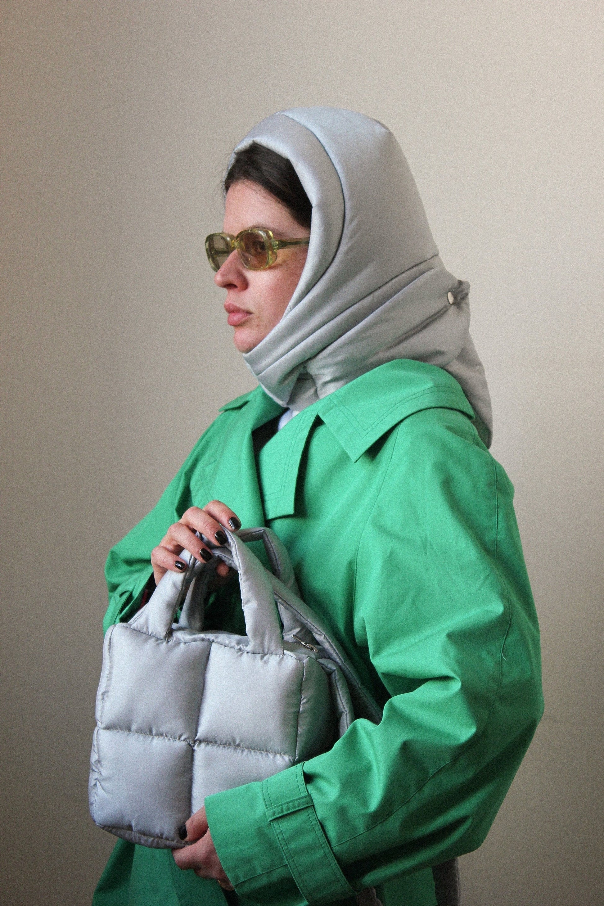 Experience the ultimate in softness and style with our Pillow Puffer Headscarf, crafted from waterproof raincoat fabric with a sumptuous cotton lining.