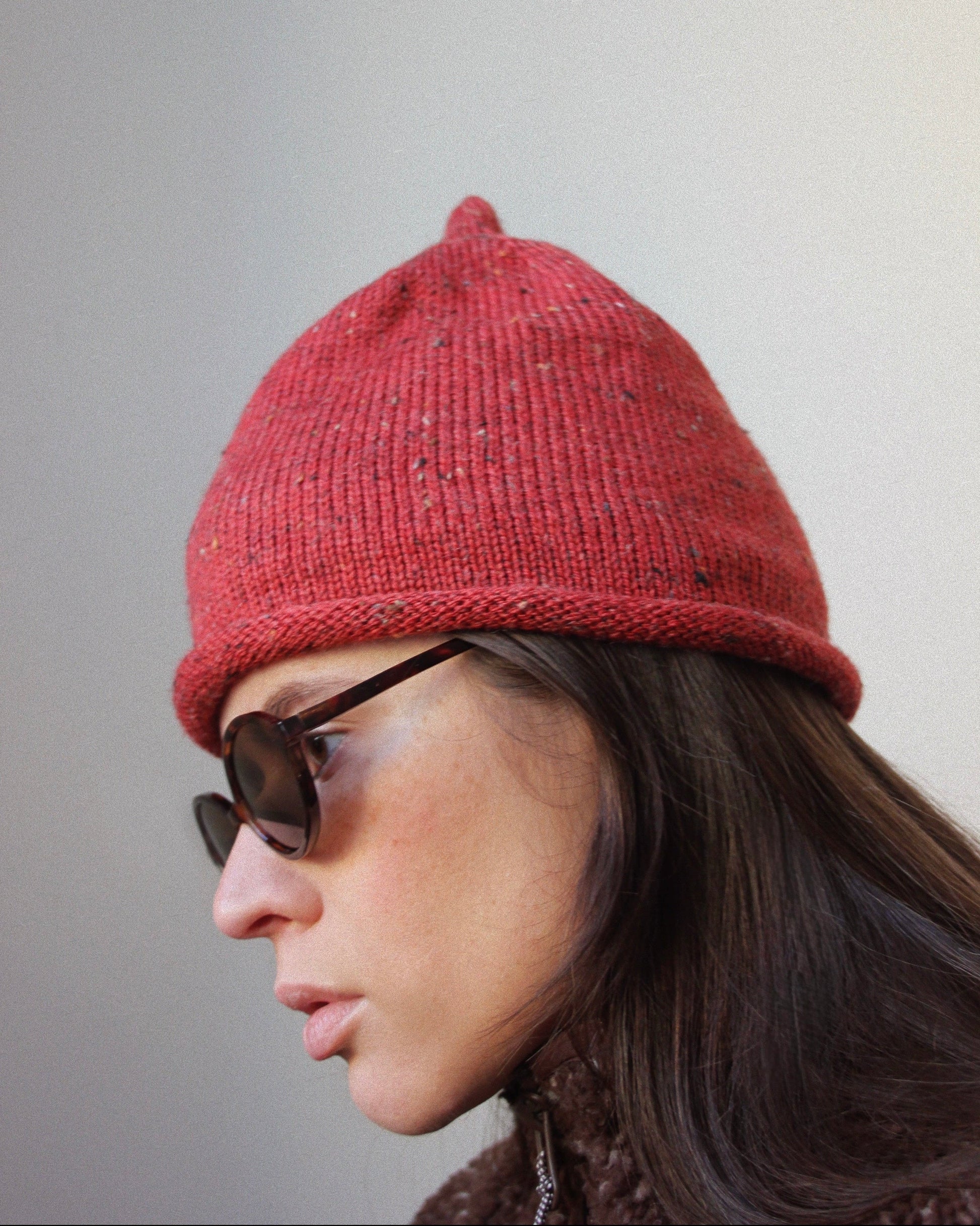 Lightweight knit with a soft cuff, crafted from a new speckled tweed yarn that looks monochrome — until you look closer.